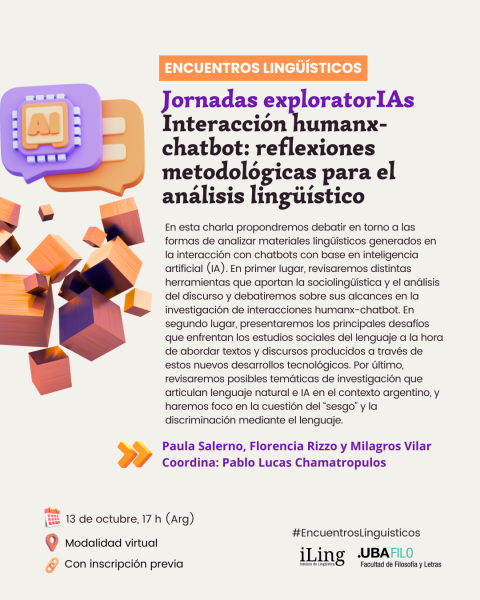El Instituto de Lingüística invita al encuentro "Interacción humanx-chatbot: reflexiones metodológicas para el análisis lingüístico", a cargo de Paula Salerno, Florencia Rizzo y Milagros Vilar, a realizarse el lunes 13 de octubre de 17 a 19 h en modalidad virtual.