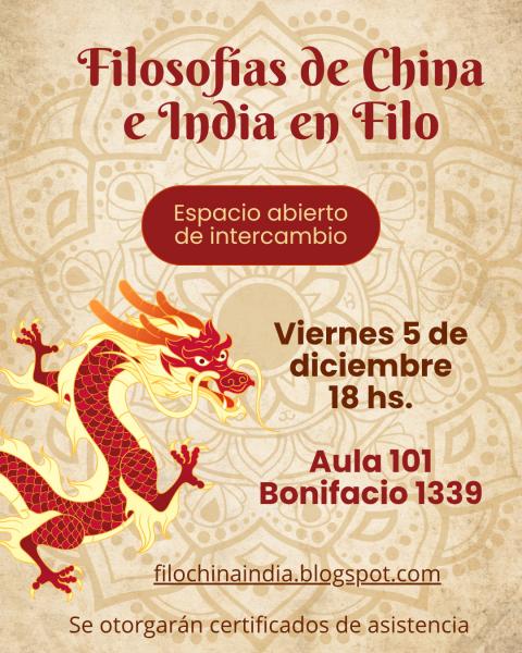 "Filosofías de China e India en Filo: espacio abierto de intercambio" es una actividad que busca promover la inclusión del estudio de las filosofías de China e India desde una perspectiva latinoamericana explorando dinámicas diferentes de los formatos académicos para incentivar la discusión fluida de ideas y la participación activa de quienes asistan. El encuentro será el viernes 5 de diciembre, 18 hs.en el Aula 101 del anexo Bonifacio, primer piso (Bonifacio 1339, CABA).