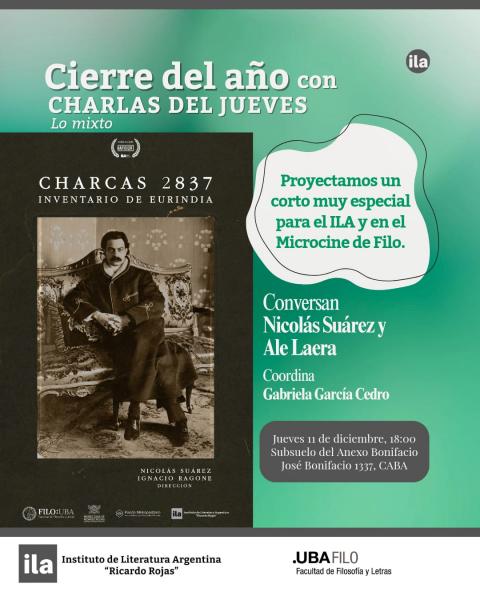El jueves 11 de diciembre el Instituto de Literatura Argentina despide el 2025 con las "Charlas del jueves. Lo mixto" en el Microcine de Filo, donde se va a proyectar un cortometraje muy especial para el Instituto y en colaboración con la Casa Museo Ricardo Rojas: Charcas 2837. El corto, que este año se estrenó en la selección Lugares del BAFICI, tuvo su origen en las Jornadas 2024 "¿Quién le teme a la crítica?" y su director es Nicolás Suárez, investigador del Instituto.