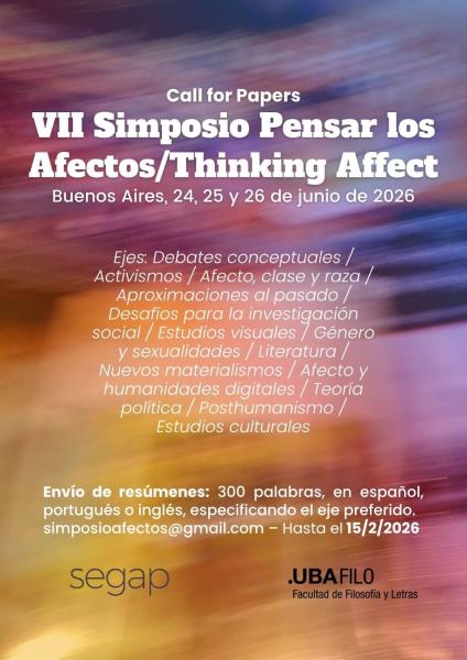 El SEGAP (Seminario sobre Género, Afectos y Política, Instituto de Filosofía Alejandro Korn, Universidad de Buenos Aires) convoca a la presentación de propuestas para participar del VII Simposio Pensar los Afectos/Thinking Affect, a  realizarse en Buenos Aires los días 24, 25 y 26 de junio de 2026. El encuentro, de carácter abierto y transdisciplinario, tiene como objetivo desplegar el debate plural construido desde el primer simposio realizado en 2013.
